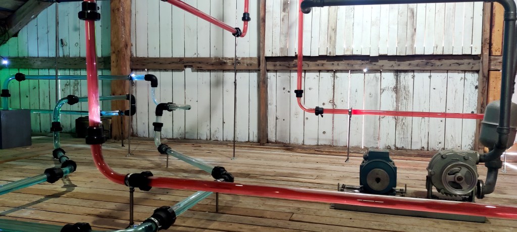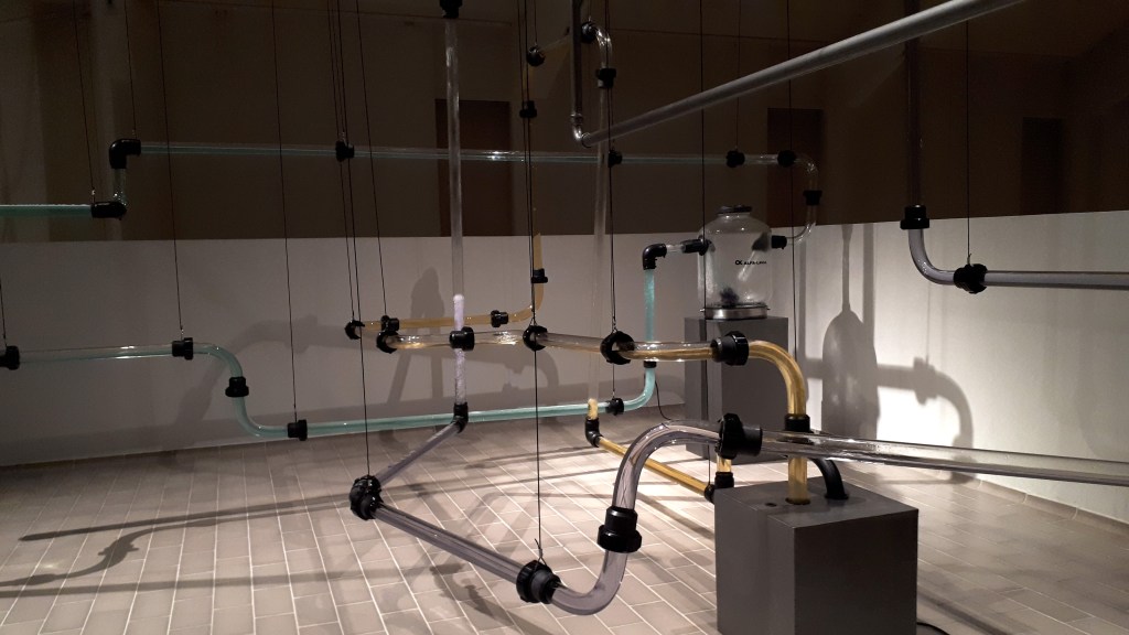 A kinetic audio installation of an old machine and pipelines used for milking cows.