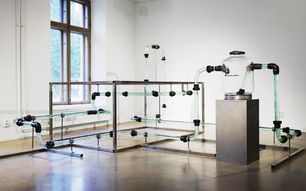 We wanted to give new life to the old machines and equipment and decided to create a kinetic installation out of old milking machines and pipelines. In the installation, we transformed the old materials into a different kind of machine and system. We also studied the acoustics and soundscapes of milking machines as well as the sounds of cows and running water and compiled them into an audio track to accompany the installation.